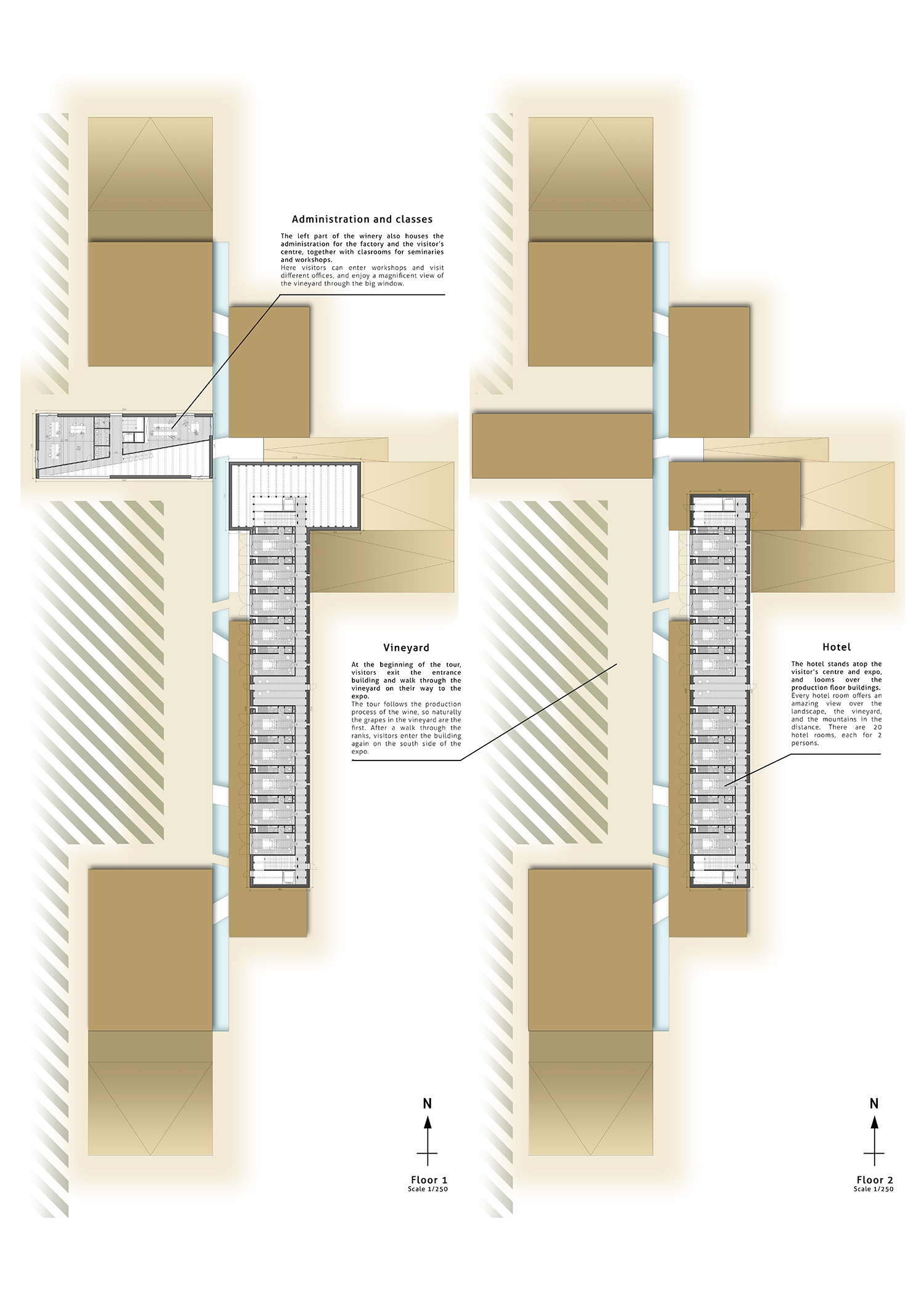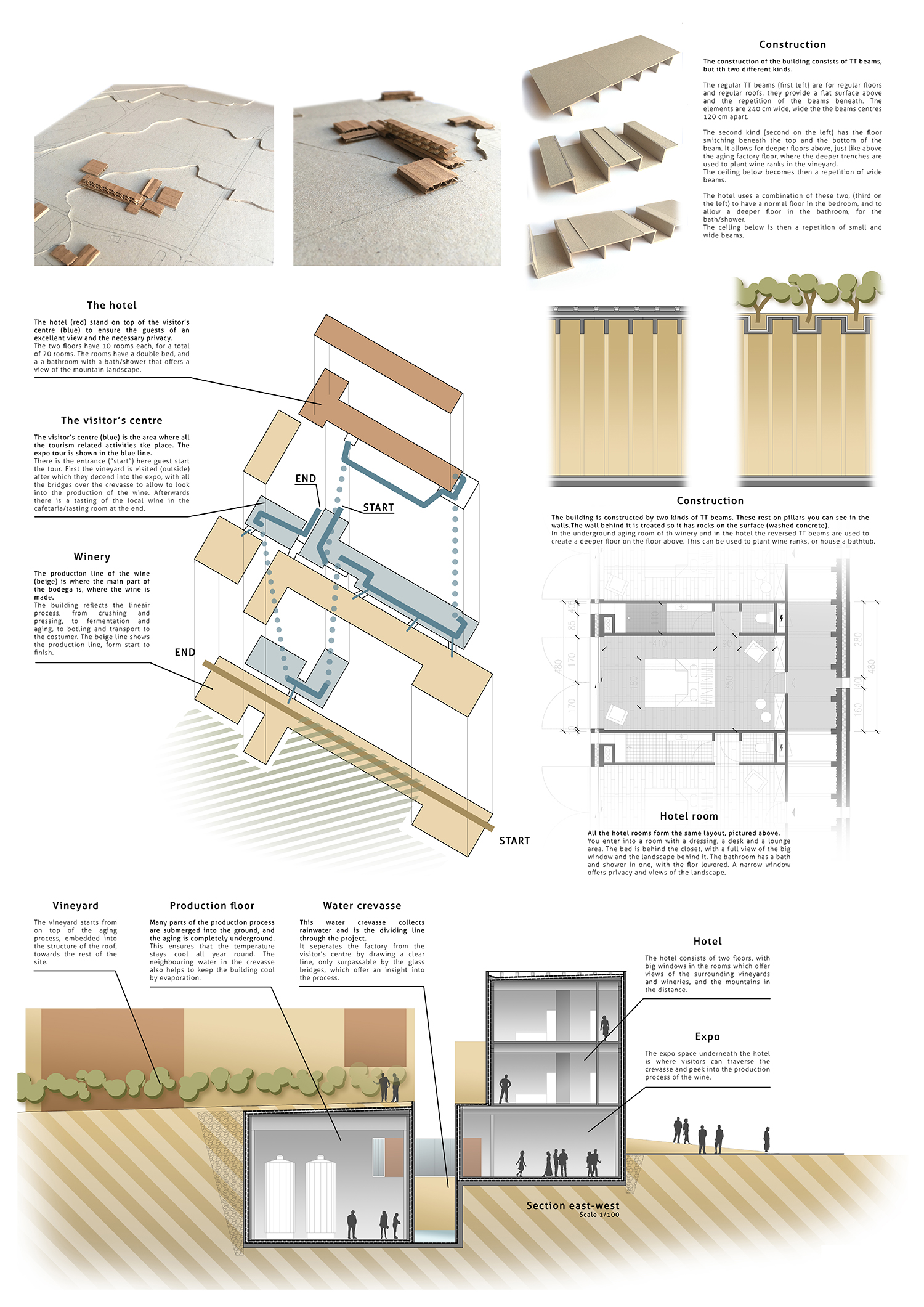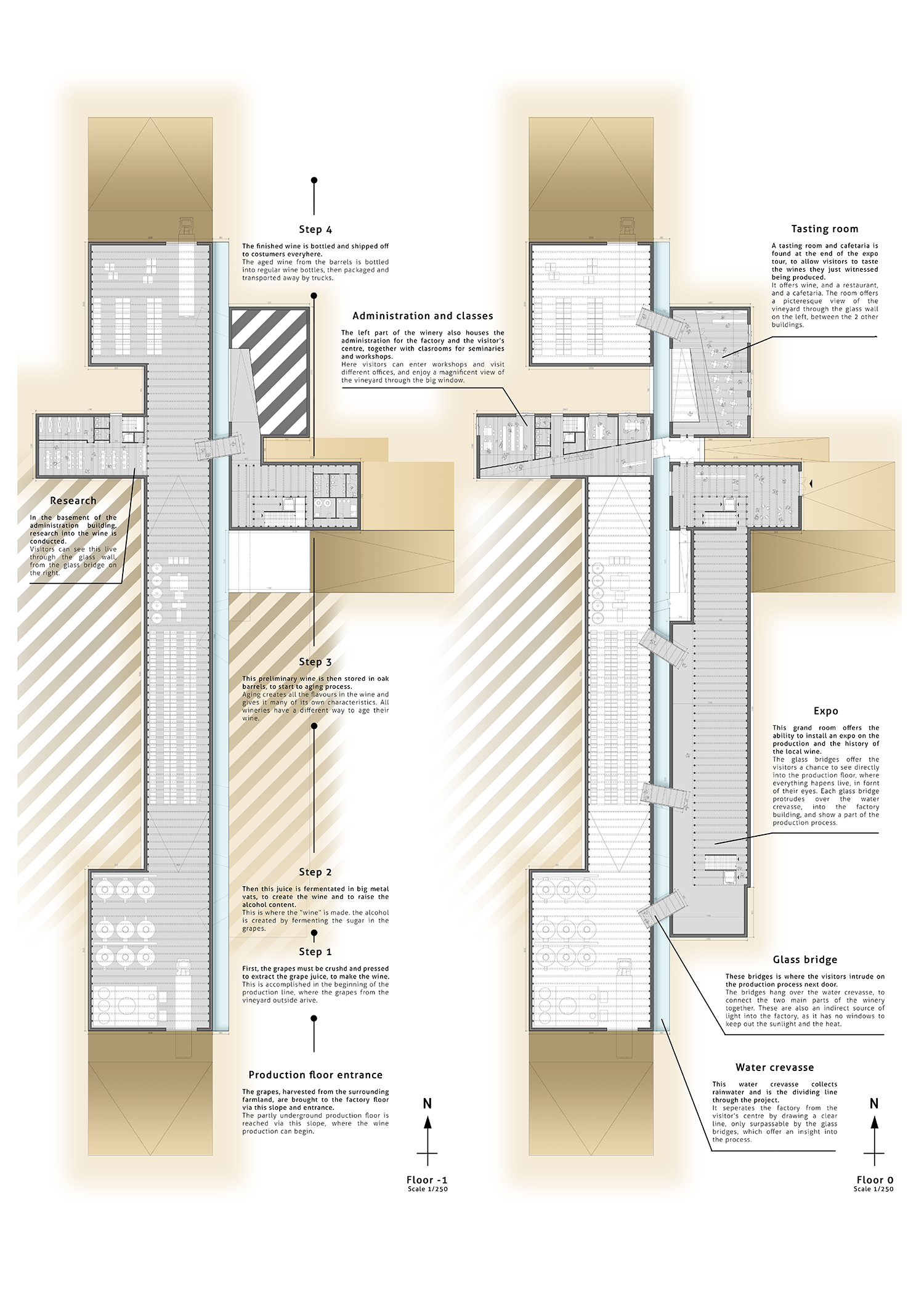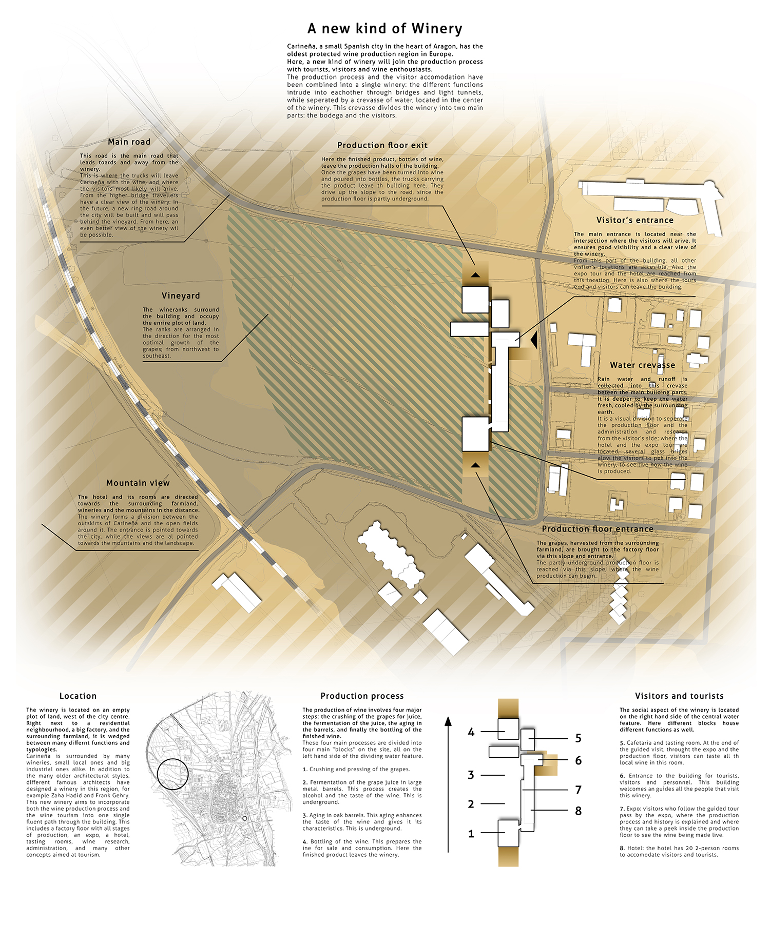 Carinena, a small Spanish city in the heart of Aragon, has the oldest protected wine production region in Europe. Here, a new kind of winery will combine the production process with tourists, visitors and wine enthousiasts. The production process and the visitor accomodation have been combined into a single winery: the different functions intrude into eachother through bridges and light tunnels, while seperated by a crevasse of water, located in the center of the winery. This crevasse divides the winery into two main parts: the bodega and the visitors.