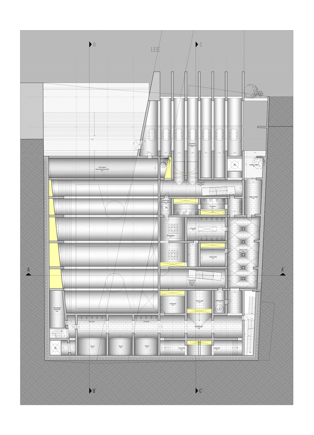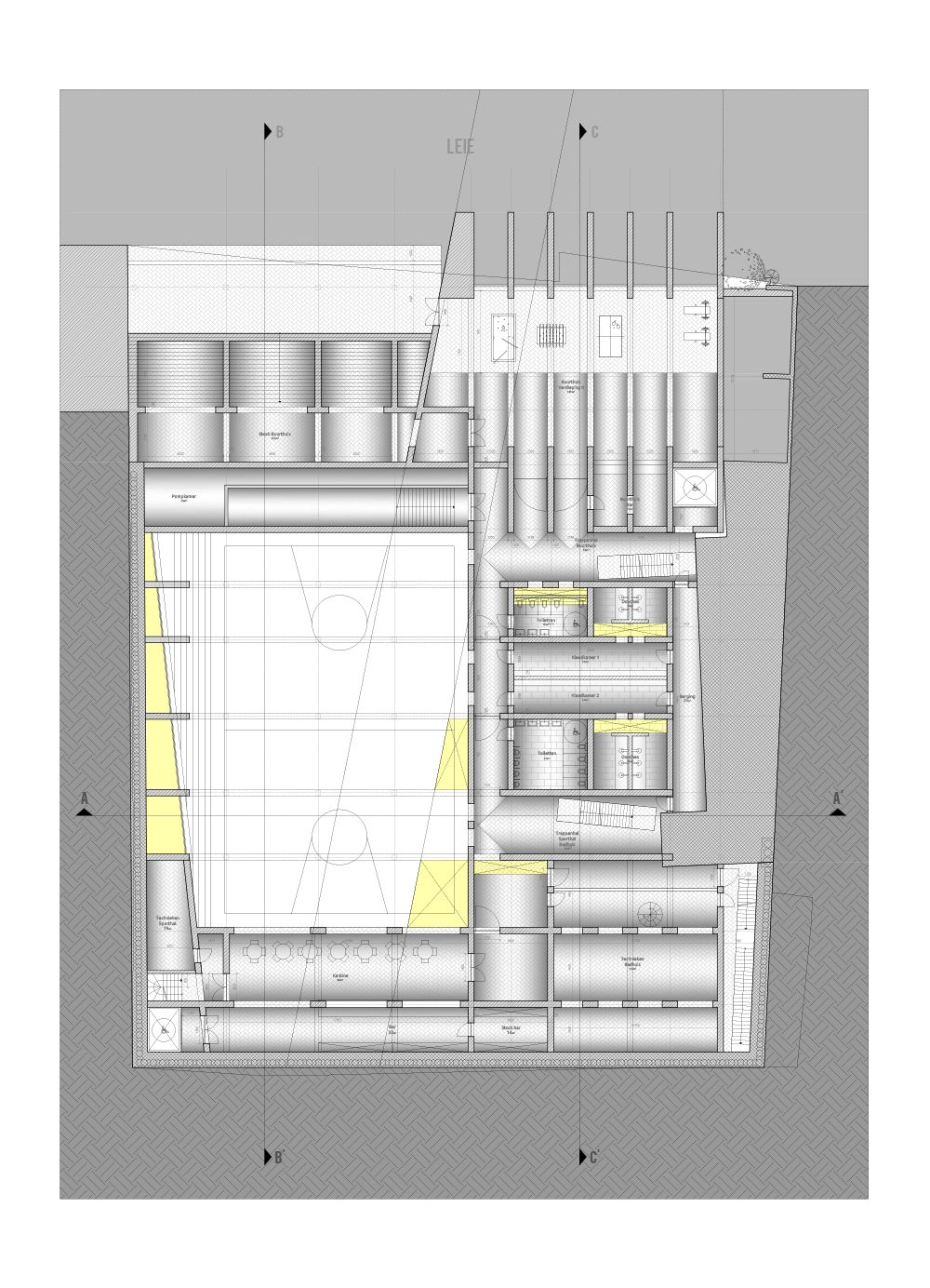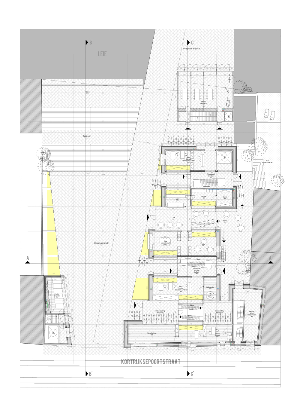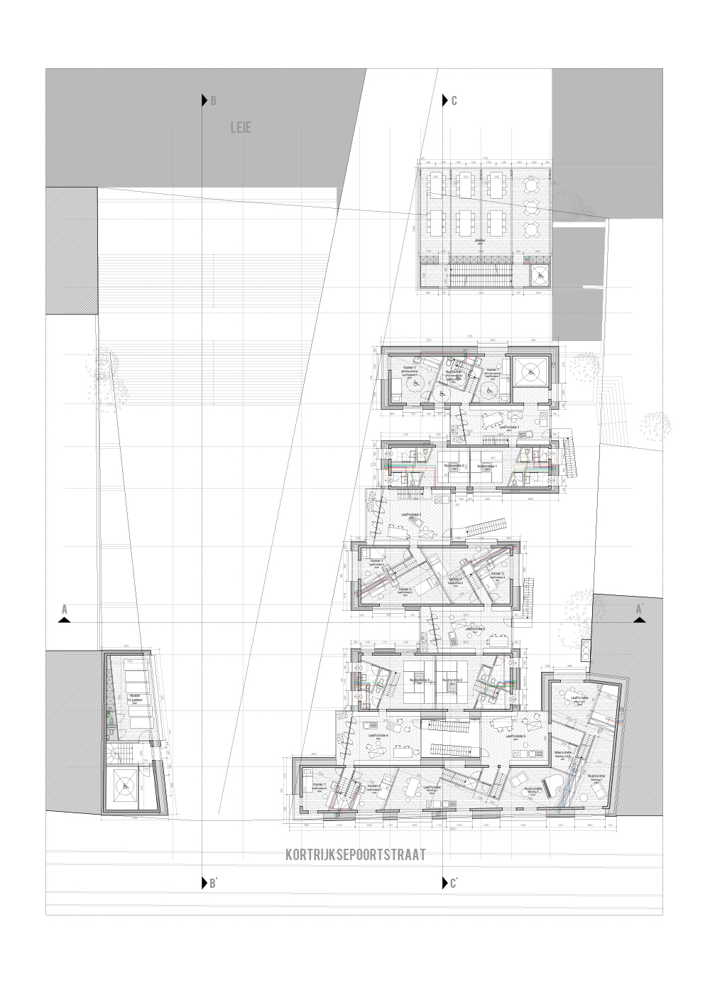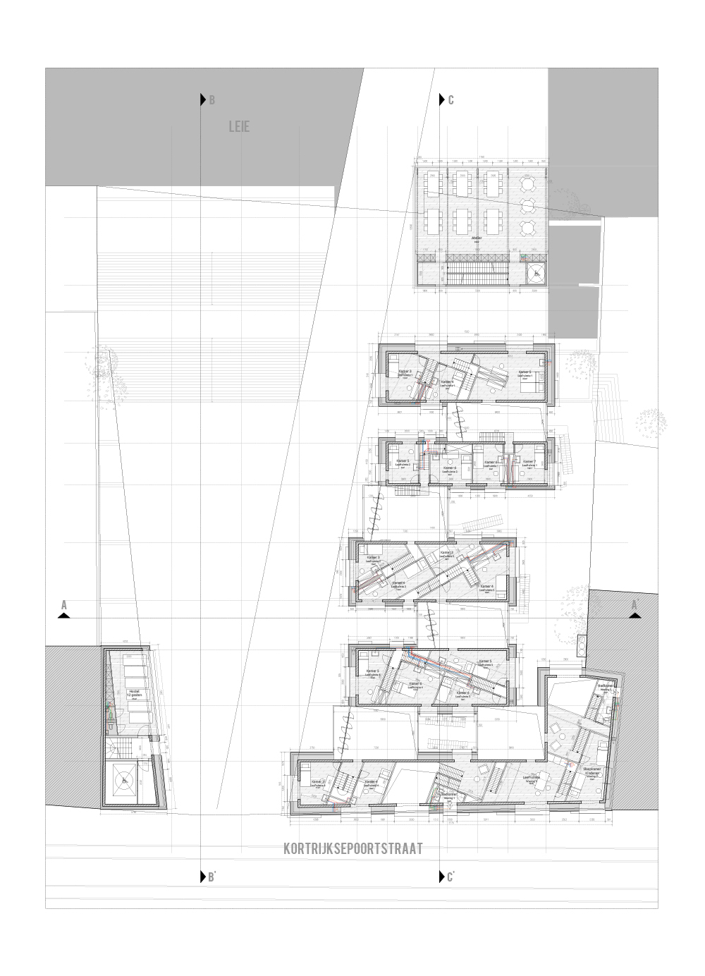 The supporting facilities are mainly located on the public ground floor, and underneath, in the brick plinth of the project. Above this public layer are the more private spaces; apartments, and houses. A gradient in these living spaces, from the most basic, the hostel with its 2m private bed, until the house, with most utilities as private, gives the possibility to every Ghent user to choose its appropriate private space acoording to his needs. Every living space uses the supporting facilities to some extent, making small but qualitative private rooms possible, ensuring a great housing density.