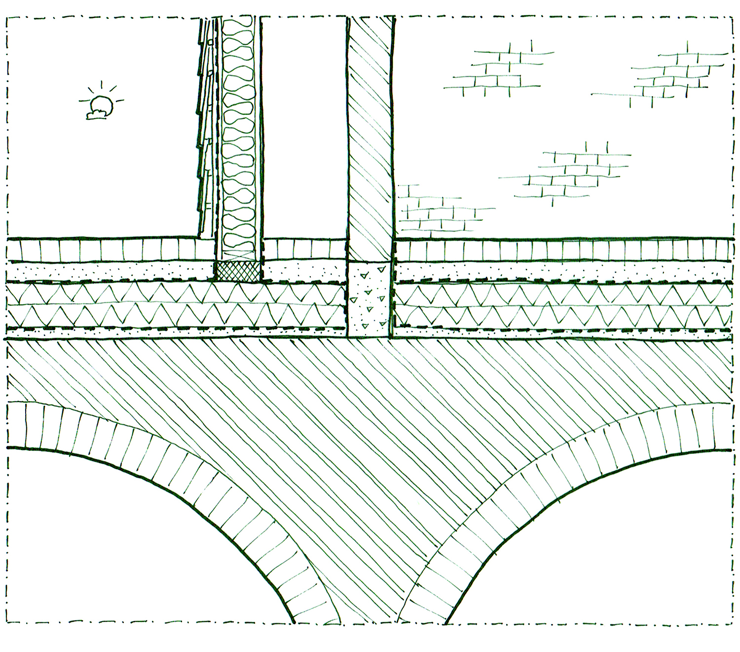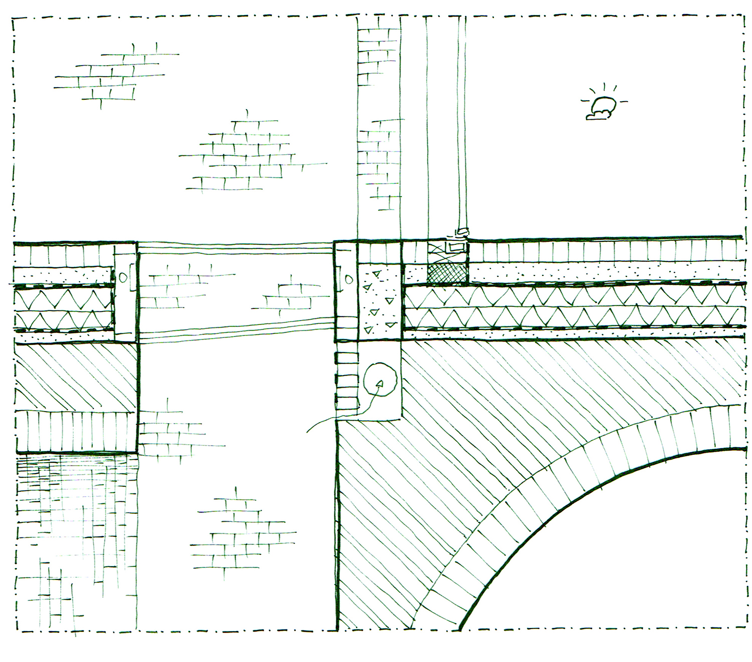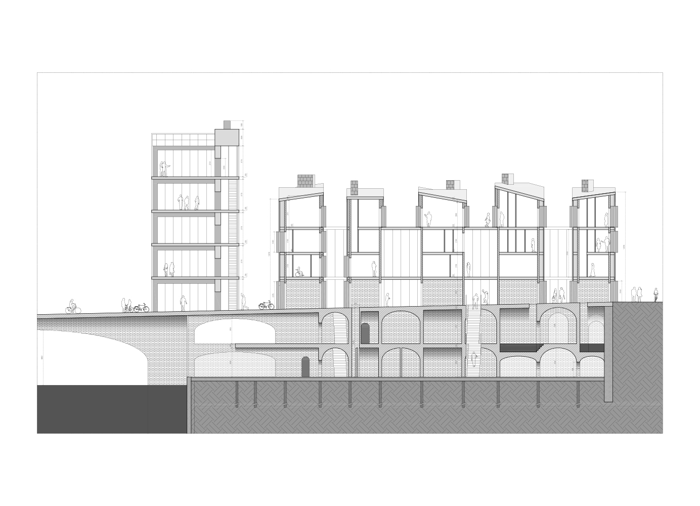 The bottom 2 floors, with public functions, comprise the plinth. This solid brick plinth utilizes the same properties of brick as the Hollebeke project; immense thermal capacity and excellent humidity and temperature control. This brick also calls for the appropriate construction; thick walls and brick vaults. Above the public street level (the street is visible on the right) construction is somewhat different; brick towers are built for strength and the same properties of thermal capacity and humidity control, as well as acoustic insulation. Around these towers an extra skin is responsible for the other necessary properties; thermal insulation and protection from rain and wind. the space between these 2 walls is used for running utilities, extra closet space, and extra room space in front of the big windows, offering a frame of the view inside. These towers hold the private rooms, apartments and houses. In between these you have the shared living spaces, with lots of glass for maximum daylight, and enjoying the second-hand heat of the brick towers around it. In summer these double walls offer a cool airflow, from below, up to the chimney, that cools the entire structure.