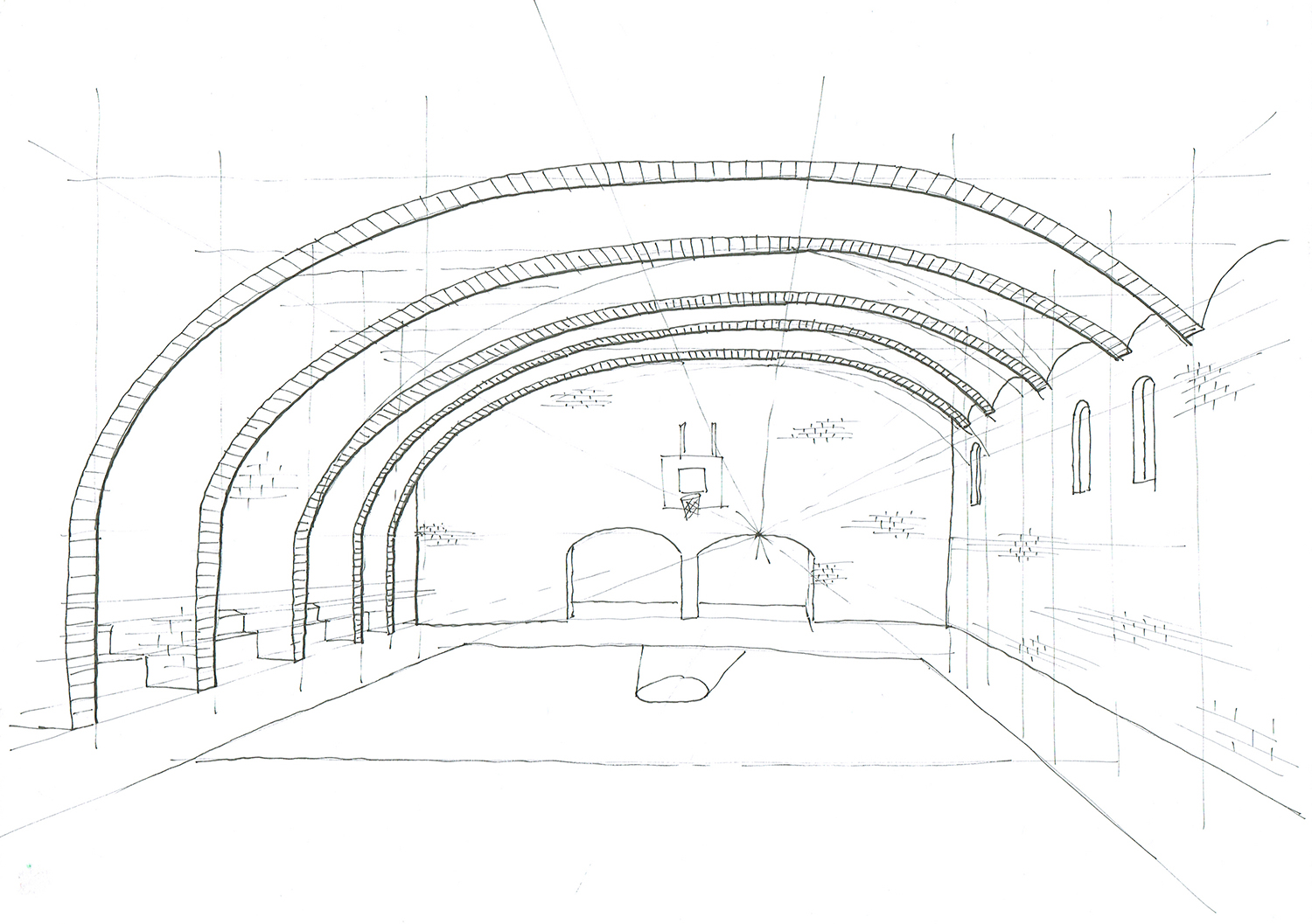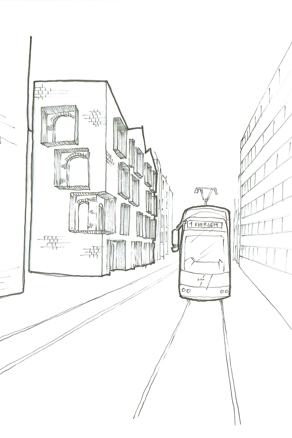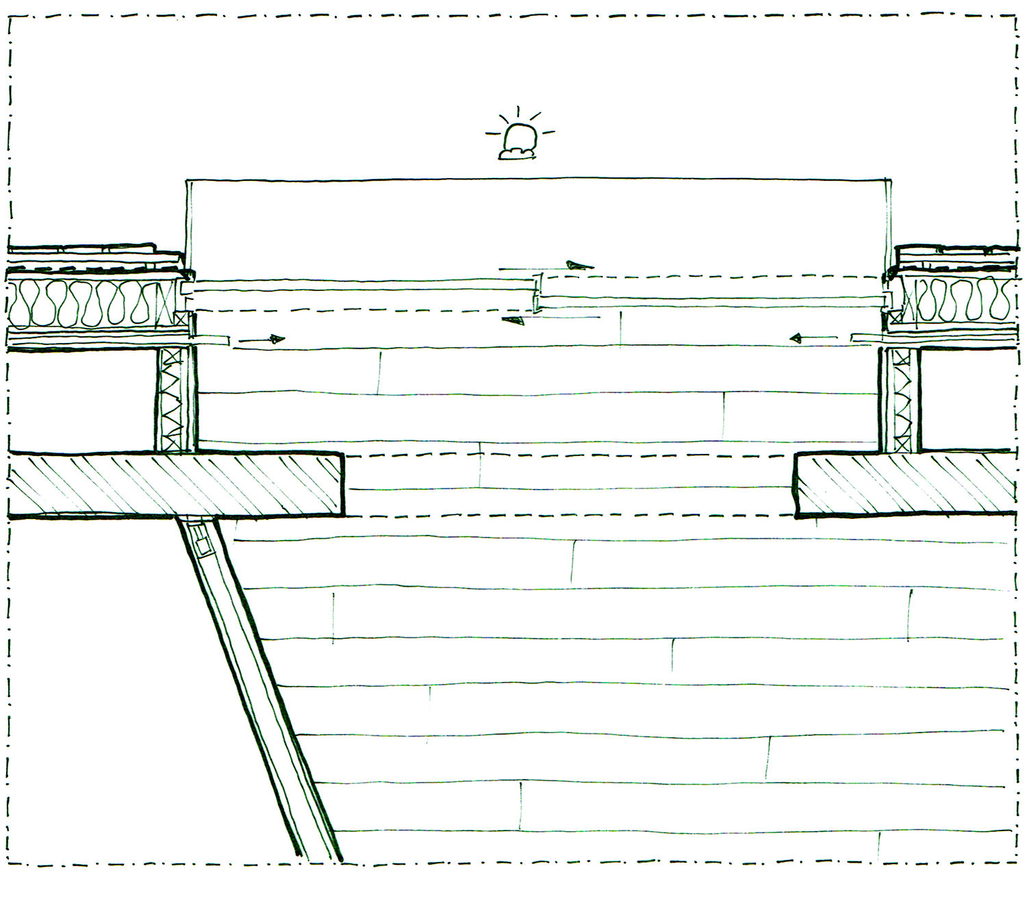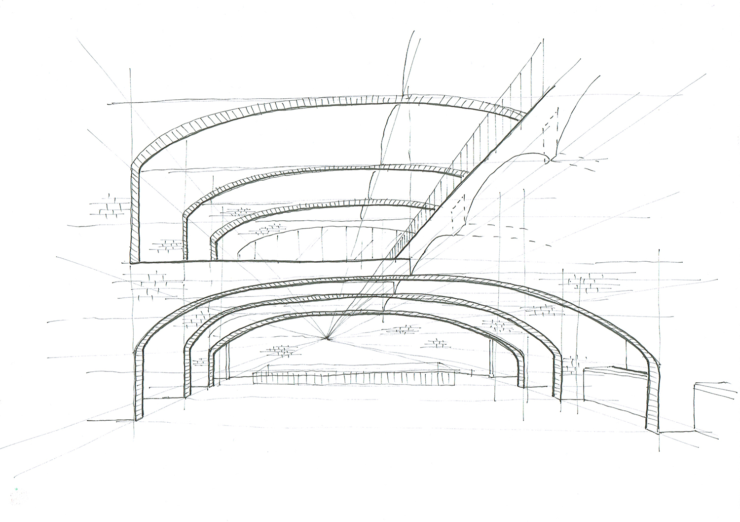 The bottom 2 floors, with public functions, comprise the plinth. This solid brick plinth utilizes the same properties of brick as the Hollebeke project; immense thermal capacity and excellent humidity and temperature control. This brick also calls for the appropriate construction; thick walls and brick vaults. Above the public street level (the street is visible on the right) construction is somewhat different; brick towers are built for strength and the same properties of thermal capacity and humidity control, as well as acoustic insulation. Around these towers an extra skin is responsible for the other necessary properties; thermal insulation and protection from rain and wind. the space between these 2 walls is used for running utilities, extra closet space, and extra room space in front of the big windows, offering a frame of the view inside. These towers hold the private rooms, apartments and houses. In between these you have the shared living spaces, with lots of glass for maximum daylight, and enjoying the second-hand heat of the brick towers around it. In summer these double walls offer a cool airflow, from below, up to the chimney, that cools the entire structure.