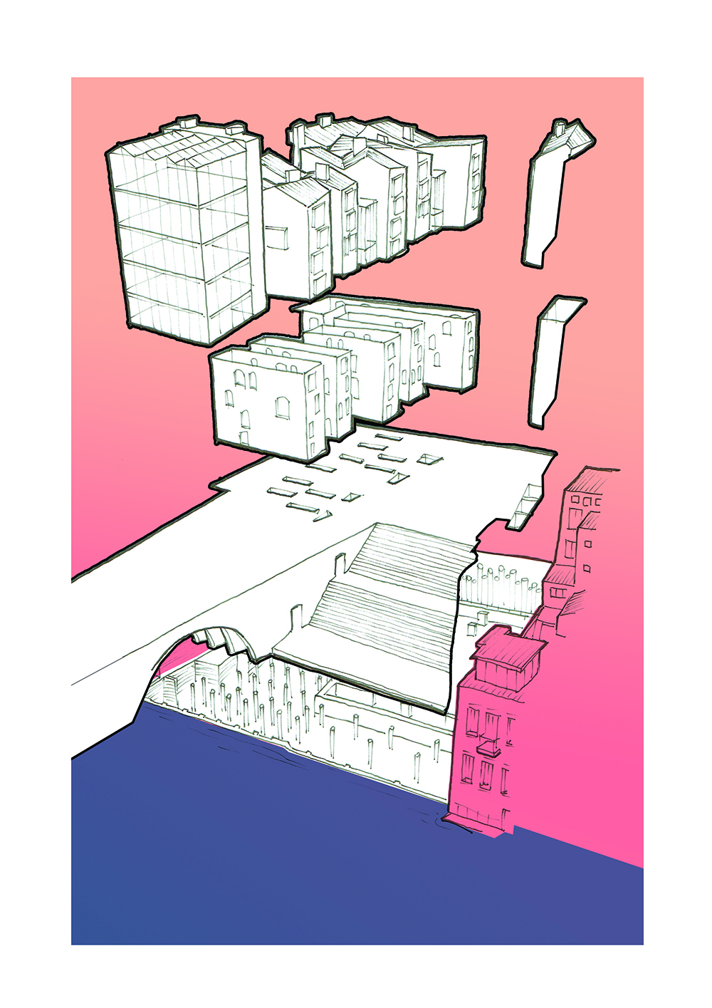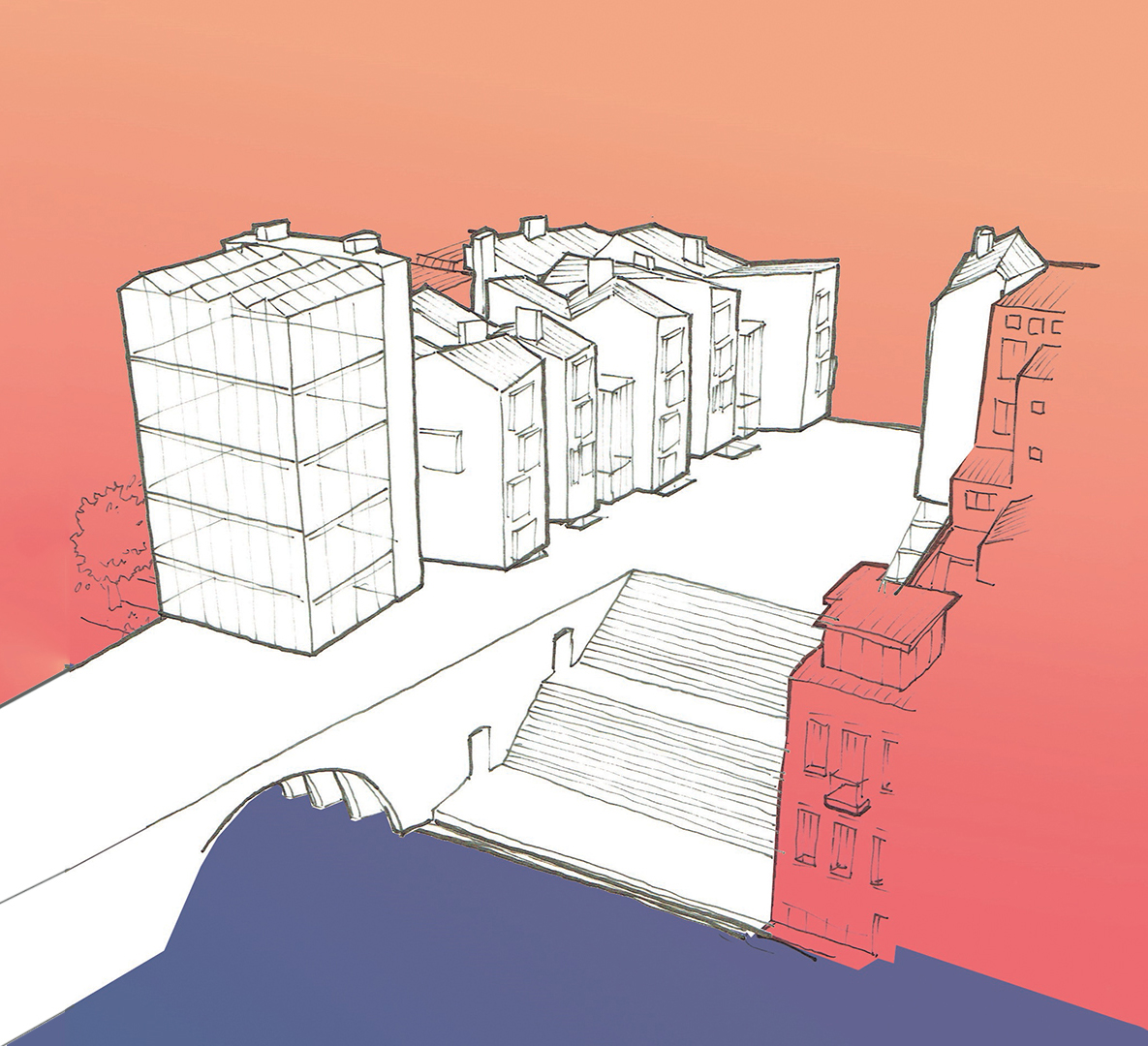 A large public space, a bath house, a sports center, a community center, public workshops and a library for tools and useful objects serve the inhabitants of these temporal living spaces and the neighbourhood surrounding them. Together they form an example of new urban living, a new durable city.