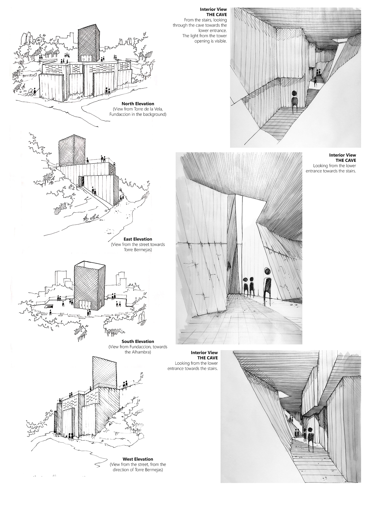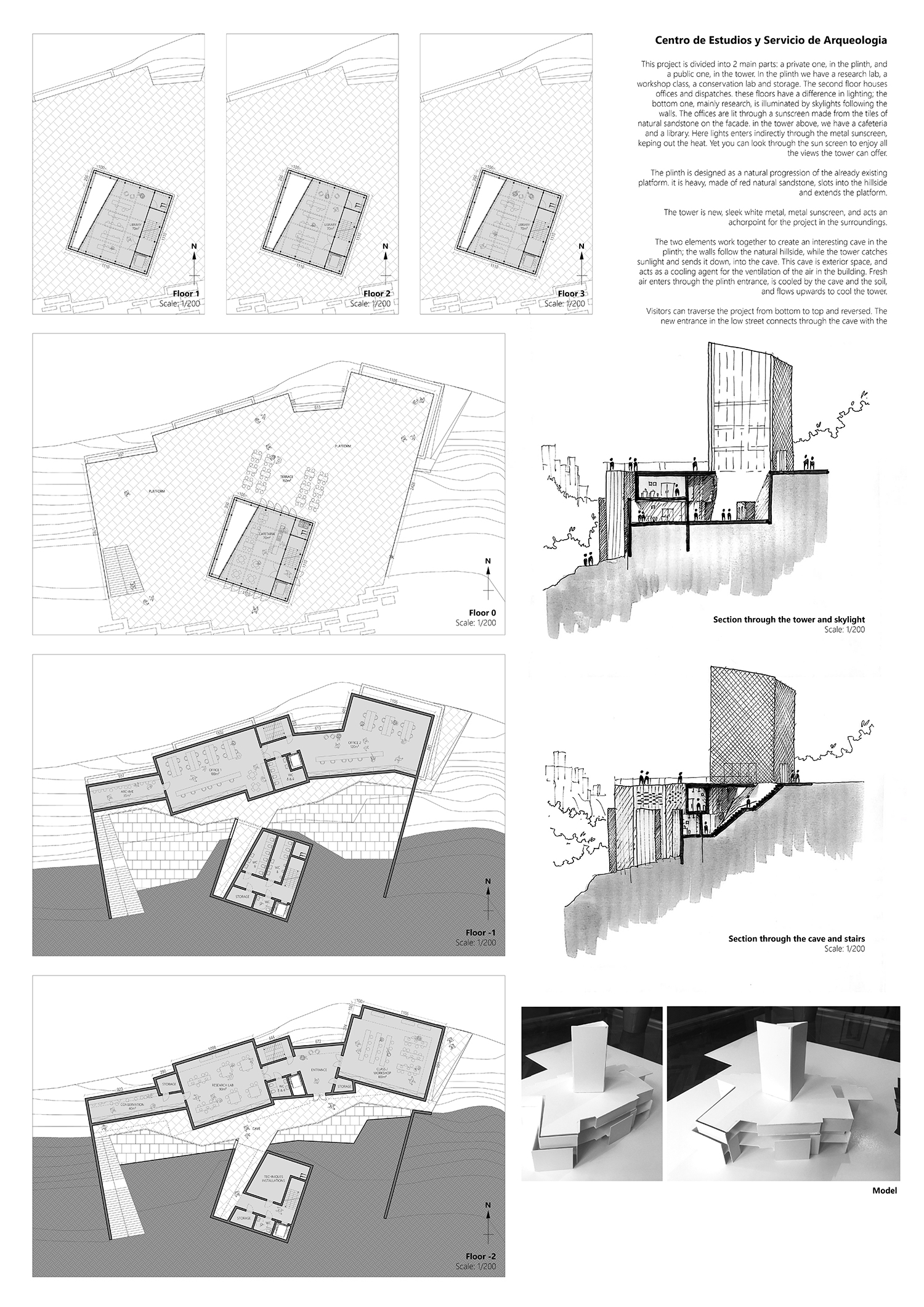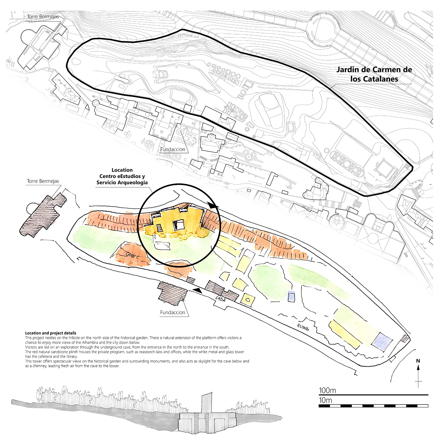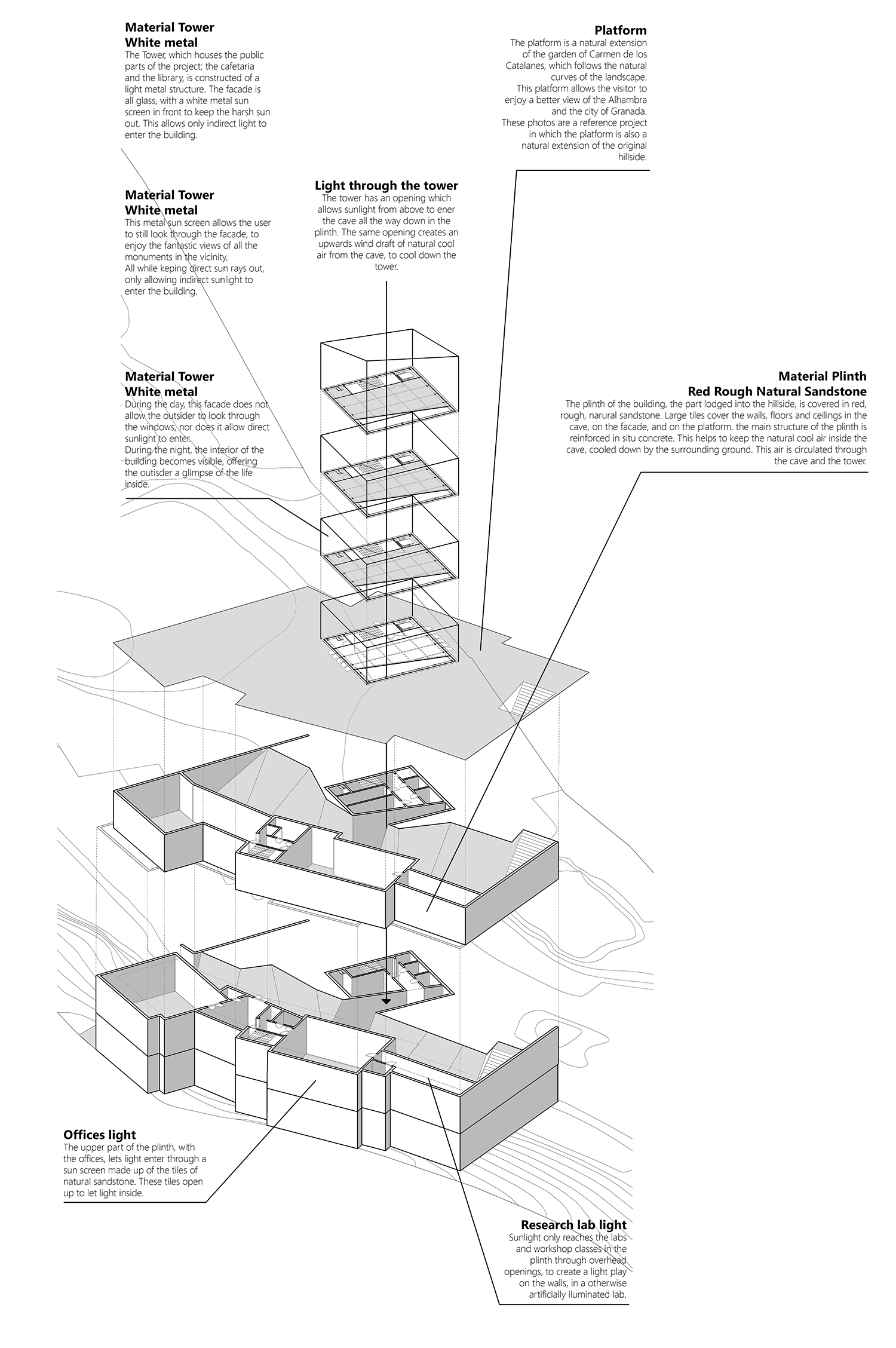 This educational and archeological services project, located in Granada, Spain, nestles on the hillside on the north side of the historical garden, Carmen de Los Catalanes, opposing the famous Alhambra. There, a natural extension of the hilltop platform offers visitors a chance to enjoy more views of the Alhambra and the city down below. Visitors are led on an exploration through the underground cave. The sandstone plinth houses the private program, such as reasearch labs and offices, while the white metal and glass tower has the cafetaria and the library. This tower offers spectacular views on the historical garden and surrounding monuments, and also acts as skylight for the cave below and as a cooling chimney, leading fresh air from the cave to the tower.