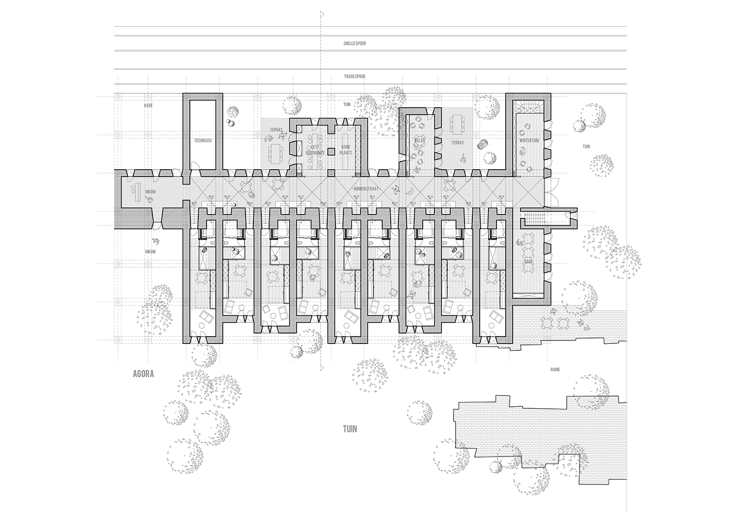 Using the traditional agricultural practices with chicory, this development enjoys all the positive effects the chicory industry has to offer. Located along the train tracks are the three main processes of chicory: the drying, the roasting and the processing of leftovers to animal feed. The residual heat of these processes is transported through a thick brick wall, parallel to the train tracks, heating the different buildings and houses. In the summer these processes are halted, because then the chicory is growing on the fields. Then these brick walls serve as heat sinks for the summer heat, maintaining a comfortable temperature inside.