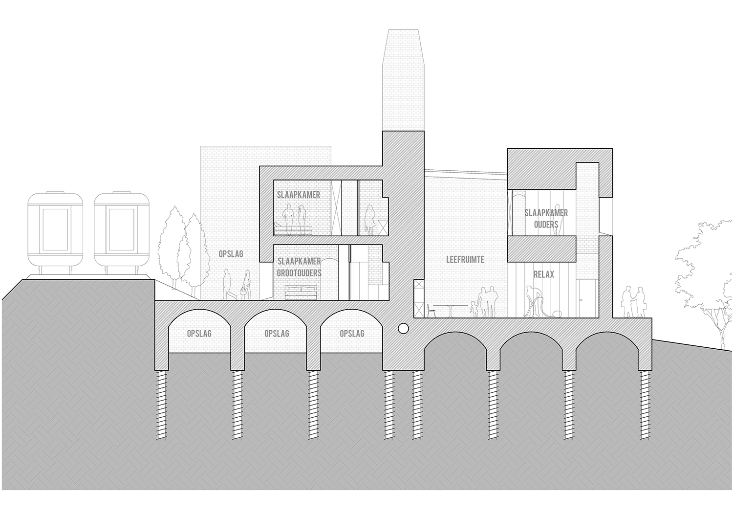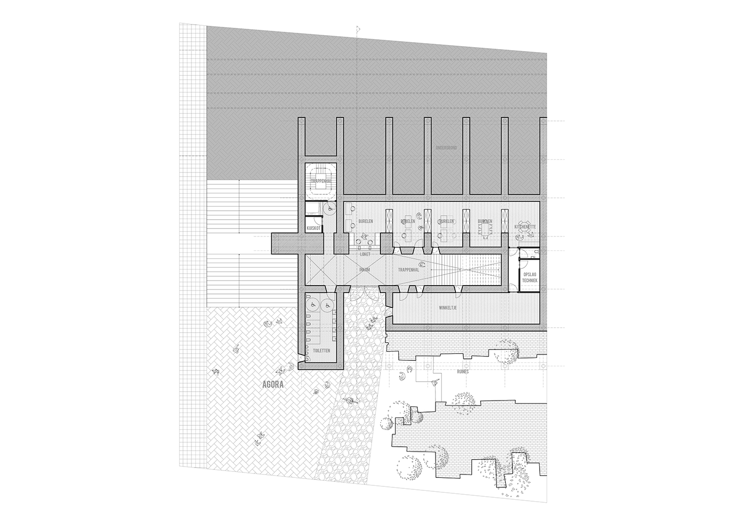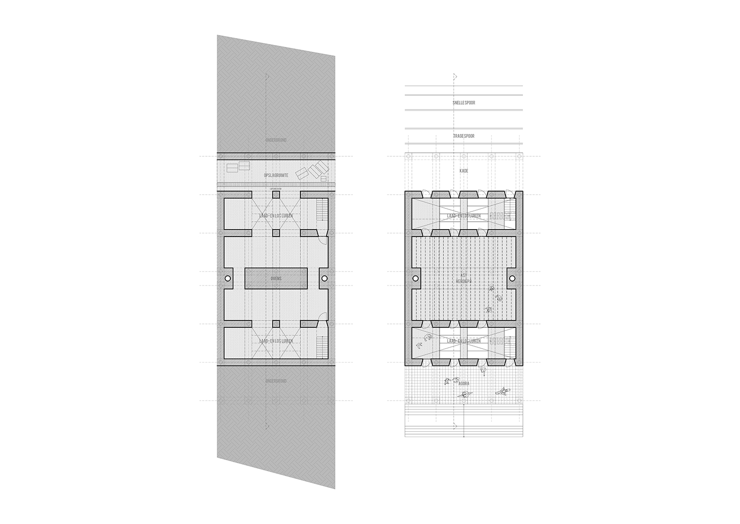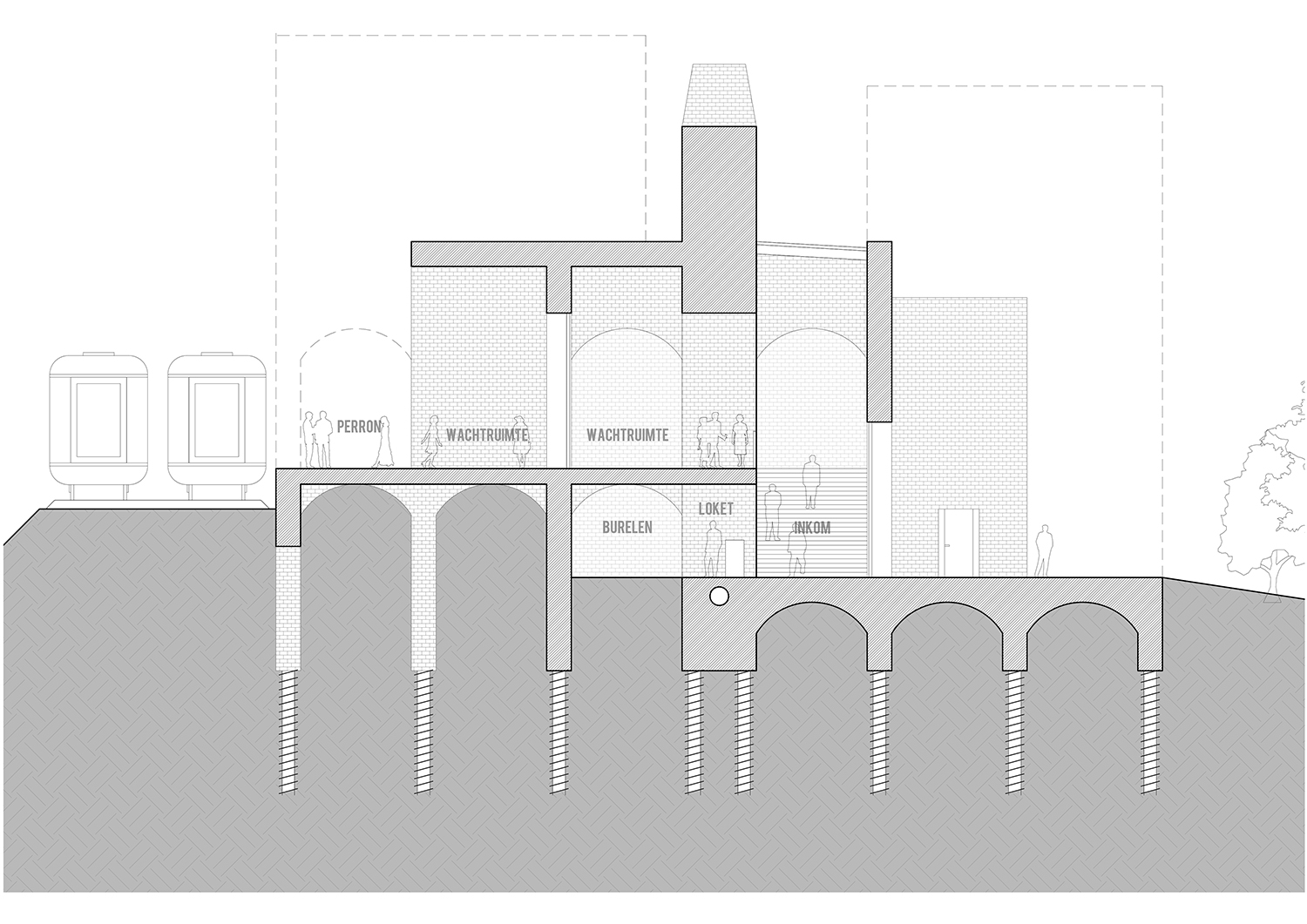 The train stops again in Hollebeke, at this train station. It uses the same qualities as the other buildings, a constant comfortable temperature and a large skylight for maximum daylight. It is located in the middle of the development, to ensure the train becomes a focus point in the new town.