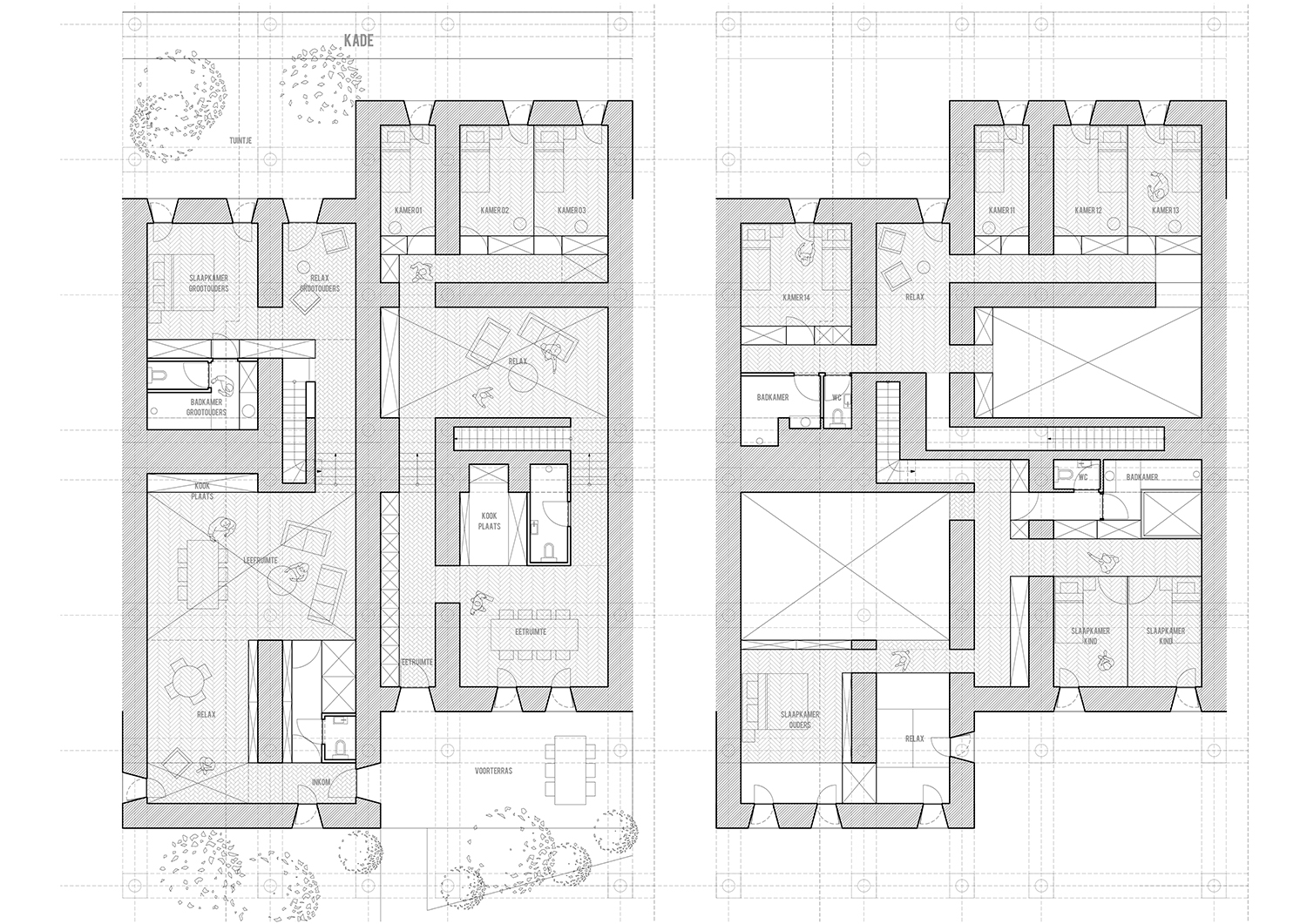 The walls are 80 cm thick, allowing the brick wall to maintain the necessary insulation standards as regular walls. The brick is exposed everywhere, allowing the bricks to control humidity and temperature. The openings are small and the rooms are covered in brick vaults. A big skylight in every house allows for a maximum of daylight in the house s main living room, while the other more private rooms are lighted with more subtle indirect light through the narrow windows.